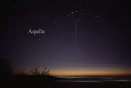 Aquila is a constellation on the celestial equator. Its name is Latin for 'eagle' and it represents the bird that carried Zeus/Jupiter's thunderbolts in Greek-Roman mythology.
