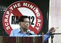 Aquilino Quilinging Pimentel Jr. (Tagalog pronunciation: [pimenˈtel], December 11, 1933 – October 20, 2019),[1] commonly known as Nene Pimentel, was a Filipino politician and human rights lawyer[2] who was one of the leading political opposition leaders during the regime of Ferdinand Marcos from the declaration of martial law in 1972 until the People Power Revolution in 1986, which removed Marcos from power.[3][4] He co-founded the Partido Demokratiko Pilipino–Lakas ng Bayan (PDP–Laban) and served as the President of the Senate of the Philippines from 2000 to 2001. He is the father of incumbent senator and former Senate President Aquilino Pimentel III. In 2018, Pimentel was identified by the Human Rights Victims' Claims Board as a Motu Proprio human rights violations victim of the Martial Law Era.[5]