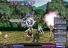 Ar tonelico features a turn-based battle system akin to those of the Atelier Iris series. The active party consists of up to three fighters in the front and one Reyvateil in the back. An action can be chosen for each fighter as their turn arrives. An action bar at the top of the screen indicates the turn order for every character and opponent involved in the battle. Fighters may choose to strike the enemy, defend themselves, use a skill, use an item, or to protect the Reyvateil.