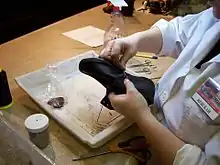 After the excavation of the Arabia, the next challenge for the partners of River Salvage Inc. was learning to clean and preserve the artifacts. During the digging process, organic artifacts had been stabilized in blocks of ice, both in Jerry Mackey's restaurant freezers as well as freezers installed in storage units in caves near the Missouri River. In the three months following the dig, larger wooden artifacts, including the stern, paddle wheel, and the lumber for two prefabricated houses found on board, were submerged in an 80-by-20-foot pool specially dug by the team.[3]: 175–186 The crew partnered with conservators working on the Mary Rose Trust in Portsmouth, England, and the Canadian Conservation Institute in Ottawa, along with the Historical Resource Conservation Branch of the Canadian Parks Service, to learn freshwater preservation techniques.[3]: 175–186 Organic materials like wood and leather are submerged in a food preservative called polyethylene glycol (PEG) and then freeze-dried. Preservationists gently remove oxidized material from metal artifacts using metal tools and special erasers. Bottled and jarred foods and beverages are injected with nitrogen, an inert gas. Shoes, boots, and garments must be restitched since their cotton thread dissolved under water.[3]: 175–186