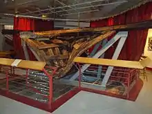 When visitors enter the museum, a series of four 5-minute videos recount the history of the Arabia's sinking and excavation. An additional 14-minute film called The Fall and Rise of the Steamboat Arabia, may also be viewed in the theater. Next, guests view the artifacts on display, as well as an open preservation lab where staff members work on cleaning the many artifacts in storage. It takes a lot of work to clean the items, even a small nail could take over an hour. Other items, like shoes and boots, may take up to three months to preserve. Finally, visitors walk a 171-foot-long full-scale reproduction of the Arabia's main deck, where they can see archival footage of the excavation process and more information about its history, along with the original boilers, engine, anchor, and the skeleton of a mule. Also on display are the 6-ton stern and a reconstructed paddle wheel. The museum additionally offers a gift shop, meeting space, and after-hours event rental.[2]