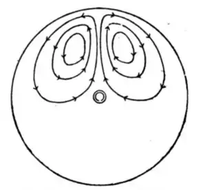 The direction of the circulation of eddy-currents is always such as to tend to oppose the relative motion. The eddy-current in the part receding from the poles tends to attract the poles forward or to drag this part of the disk backwards. The eddy-current in the part advancing toward the poles tends to repel those poles and to be repelled by them. It is obvious that any slits cut in the disk will tend to limit the flow of the eddy-currents, and by limiting them to increase the resistance of their possible paths in the metal, though it will not diminish the electromotive-force. In the researches of Sturgeon[9][10][11] a number of experiments are described to ascertain the directions in which the eddy-currents flow in disks. Similar, but more complete researches were made by Matteuci. The induction in rotating spheres was mathematically investigated by Jochmann, and later by the lamented Hertz.
