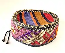 An arakhchi (Armenian: արախչի, romanized: arakhchi, is a traditional Armenian[1][2][3][4] hat that was also worn by the Azeri Turks, made from specially woven silks, that is the most persistent of traditional garments, sometimes worn over a low (6 cm) flat topped skullcap (araqčın), almost covered with gold embroidery, or alternatively a small bonnet (täsäk).}}</ref> flat top skull cap headdress, worn by both men and women in the past.