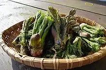 In Korean, the young shoot is called dureup (두릅), and the plant is called dureupnamu (두릅나무, "dureup tree"). Young shoots are harvested during a month, from early April to early May, when they are soft and fragrant. In Korean cuisine, the shoots are commonly eaten blanched as namul, pickled as jangajji, pan-fried as jeon, or deep-fried as bugak.