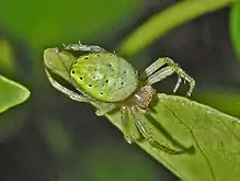Adults can be found mainly from May to July, but females last as late as September. [3] These spiders do not use a hideout, because they are camouflaged by their green colour. They weave their orb-web between leaves and flowers. These webs are irregularly shaped and only about 100 mm (3.9 in) in diameter. They have between 15 and 30 rays. The spider usually stands in the middle of the web while waiting for prey. Egg sacs are commonly attached to the underside of leaves. [9]
