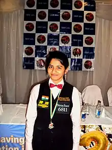 Prior to this she has won ten National and two Maharashtra State Championships. She made history and created a record by winning four titles at a single Nationals (Indore 2008). This made her the first-ever Indian cueist (male or female) to accomplish this feat. She won the National Senior Women's Billiards Championship in 2012 and 2015, and the National Six Red Snooker Championship in 2012.[12] At 17 years of age, she represented India at the 2007 IBSF World Under-21 Snooker Championship, held at Goa and was a semi-finalist.