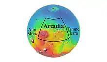 Arcadia is the name of a telescopic albedo feature located at 45° north latitude (N) and 260° east longitude (E) on Mars. The feature was named after a mountainous region in southern Greece.[4] The name was approved by the International Astronomical Union(IAU) in 1958.[5]