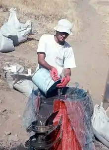 Flotation machine in use at Hallan Çemi, southeast Turkey, c. 1990. Note the two sieves catching charred seeds and charcoal, and the bags of archaeological sediment waiting for flotation.