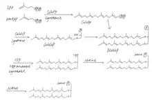 Archaea utilize biosynthetic pathways of isoprenoids that is distinct compared to bacteria and eukarya. The C5 precursors to the geranylgeranyl chains are isopentenyl pyrophosphate (IPP) and dimethylallyl pyrophosphate (DMAPP), which are produced by modified mevalonic acid pathway.[8]