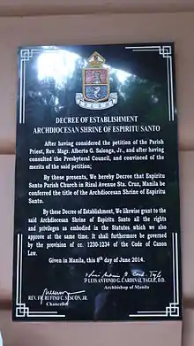 - "Espiritu Santo Parish Declared Archdiocesan Shrine". The Roman Catholic Archdiocese of Manila. Archived from the original on September 24, 2015. Retrieved April 4, 2015.