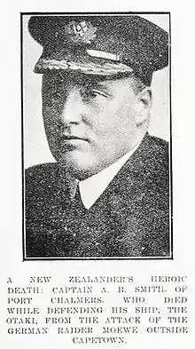 The raider ordered Otaki to stop but Captain Smith refused. A duel ensued, during which Otaki secured a number of hits and caused Möwe considerable damage, but Otaki sustained much damage and was on fire. Captain Smith therefore ordered his crew to abandon ship, but he himself stayed aboard and went down with his ship.