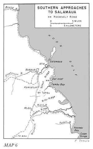 Overcoming significant command ambiguities between American and Australian forces because of overlapping spheres of operation, Roosevelt played an important role in the Salamaua campaign. His service was recognized when one of the hotly contested ridge-lines northwest of the island's Tambu Bay was named in his honor. This piece of key terrain during the campaign was originally referred to as "Roosevelt's Ridge" to mark the ridge nearest his battalion to higher HQ. Later, it was referred to as "Roosevelt Ridge" as it was depicted in the official American and Australian campaign histories as well as the US Army Air Force World War II Chronology. See left map.[9][10][11][12]