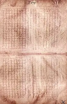This medieval Byzantine manuscript then traveled from Constantinople to Jerusalem, likely sometime after the Crusader sack of Byzantine Constantinople in 1204.[7] There, in 1229, the Archimedes codex was unbound, scraped and washed, along with at least six other partial parchment manuscripts, including one with works of Hypereides. Their leaves were folded in half, rebound and reused for a Christian liturgical text of 177 later numbered leaves, of which 174 are extant (each older folded leaf became two leaves of the liturgical book). The palimpsest remained near Jerusalem through at least the 16th century at the isolated Greek Orthodox monastery of Mar Saba. At some point before 1840 the palimpsest was brought back by the Greek Orthodox Patriarchate of Jerusalem to its library (the Metochion of the Holy Sepulcher) in Constantinople.