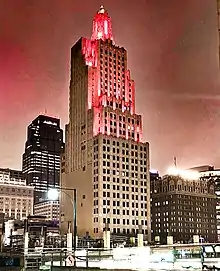 Built to replace the Fidelity National Bank and Trust Building that had existed on that site, it was designed by Hoit, Price and Barnes Architects, the same firm that designed the Power and Light Building. It won a local American Institute of Architects award in the 1930s during its construction. The twin towers at its top resemble those of notable buildings around the United States, such as 900 North Michigan in Chicago (built in 1989), or the Waldorf-Astoria Hotel in New York City (built in 1931). The building once had a large clock in its north tower that has long since been removed.[12]