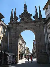 Sometime in the 17th century, Archbishop José de Bragança, ordered the reconstruction of the Porta Nova gate, to include the extension of Rococo decoration.[2] As part of its construction (1772–1773), a statue representing the city of Braga was removed from the Edifício das Arcadas and installed on the arch of the new gate (around in 1772).[1] Followed the following year by the archbishop (Gaspar de Bragança) ordering the transformation of the tower of the Porta Nova, to a triumphal arch in the Baroque style.[1]