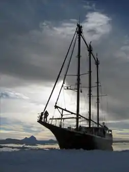 Originally, the team hoped to find a modest 18-metre sailing vessel that would suit their purposes.[16] In 2001, Lemire and five others acquired a 51-metre steel-hauled sailboat which had been refurbished from a North Sea fishing boat in 1992, and re-fitted it into an expedition vessel with cabins to sleep twenty crew,[6] two DVC Pro editing suites,[13] three high-density cameras[6][13] and a system of satellite communication which would allow hundreds of thousands to follow the voyage.[16] Rechristened the Sedna IV after the Inuit goddess of the sea, the three-masted schooner was now an oceanographic vessel and seagoing cinematographic studio,[16] specifically designed for filming documentaries, collecting data for scientific studies, and serving as a "floating media lab" for students around the world.[14]