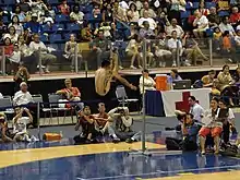 The toe kick discipline consists of an athlete jumping over a stick, then tapping that stick with their toes and land on both feet.[16]