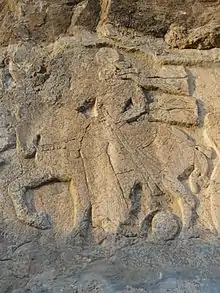 According to Arabic-Persian sources, Ardashir started his uprising when he was the commander of Fort Darabgard in eastern Pars. The oldest archaeological proofs of the period of Ardashir's reign are acquired from Ardashir-Khwarrah (Gor or current Firuzabad) in south border of Pars. Therefore, Ardashir rose up in his war in Ardashir-Khwarrah, far from the fortress of local Persian shahs in Istakhr and farther from the Parthian Empire. The beginning of Ardashir's uprising may be related to his first inscription in Firuzabad; in the inscription, he is shown acquiring the royal ring from Ahura Mazda in front of his henchmen.[36] Ardashir began the procedure of extending his reign by killing some local kings and taking their domains. According to Al-Tabari's report, Ardashir then asked Papak to stand against Gochihr and start a rebellion. Papak did it and rebelled against Gochihr and killed him.[35] Daryaee believes that Papak was a local governor who dreamed of conquering Istakhr and was eventually able to achieve it by the help of his older son Shapur; that means in contrast to Al-Tabari's report, it was not Ardashir's request and order that caused Papak's rebellion against Gochihr, governor of Istakhr, and it can be implied from the common coins of Papak and Shapur.[18] Later, Papak wrote a letter to Artabanus IV and requested permission to appoint Shapur instead of the "overthrown" Gochihr in power; in response, Artabanus announced Papak and Ardashir outlaws.[37] Although Artabanus had defeated the Romans, he faced the problem of the defiance of Vologases VI, who had minted coins in his own name between 221 and 222; and this shows that no powerful emperor controlled the Parthian Empire then. During the time that Artabanus was dealing with a more important challenge, he could not pay much attention to the rise of a newcomer in Pars.[2] After a while, Papak died in an unknown date and Shapur ascended to the throne; afterward, the contest and fight started between the two brothers (Shapur and Ardashir), but Shapur died in an accidental way. According to sources, Shapur stopped at a ruin while assaulting Darabgard and a stone suddenly separated from the ceiling and hit his head and Shapur succumbed immediately. After the incident, the brothers relinquished the Persian throne and crown to Ardashir, who became the Persian Shah thereafter.[22][37] Ardashir and his followers could be considered the main suspects of Shapur's mysterious death, since they "benefitted from the accidental death"; but the accusation is not provable.[27]