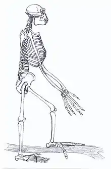 The upper pelvis (distance from the sacrum to the hip joint) is shorter than in any known ape. It is inferred to have had a long lumbar vertebral series, and lordosis (human curvature of the spine), which are adaptations for bipedality. However, the legs were not completely aligned with the torso (were anterolaterally displaced), and Ardipithecus may have relied more on its quadriceps than hamstrings which is more effective for climbing than walking.[20][8] However, it lacked foot arches and had to adopt a flat-footed stance. These would have made it less efficient at walking and running than Australopithecus and Homo. It may not have employed a bipedal gait for very long time intervals.[4] It may have predominantly used palm walking on the ground,[21] Nonetheless, A. ramidus still had specialized adaptations for bipedality, such as a robust fibularis longus muscle used in pushing the foot off the ground while walking (plantarflexion),[18] the big toe (though still capable of grasping) was used for pushing off, and the legs were aligned directly over the ankles instead of bowing out like in non-human great apes.[22]