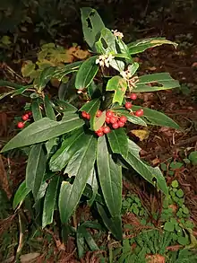 Ardisia crispa, the Japanese holly, is a species of flowering plant in the family Primulaceae.[2] It is found in the eastern Himalayas, Assam, southern China, Indochina, Taiwan, Korea, the Ryukyu Islands, and Japan, and has been introduced to Queensland, Australia, and the Windward Islands in the Caribbean.[1] An evergreen perennial shrub reaching at most 1.5 m (5 ft), it is often sold as an ornamental for its dark green leaves and long‑lasting red berries, much like Ardisia crenata, the Christmas berry or coralberry.[3][4][5]