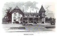 Originally named "Athensville" in 1853, the community and its railroad station were renamed Ardmore in 1873 by the Pennsylvania Railroad, on whose Main Line, west out of Philadelphia, Ardmore sits at Milepost 8.5.[5] The Autocar Company moved its headquarters to Ardmore in 1899 and constructed a factory on the edge of the downtown area. The factory closed in 1954; during demolition in 1956, a major fire broke out that threatened the downtown area before it was extinguished. Today, Ardmore consistently ranks among the most desirable suburbs of Philadelphia.[6][7][8]