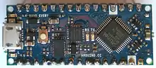 The Arduino Nano was released in 2008. In 2019, Arduino released the Arduino Nano Every, a pin-equivalent evolution of the Nano. It features a more powerful ATmega4809 processor and twice the RAM.[3]