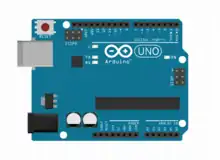 The Arduino Uno is an open-source microcontroller board based on the Microchip ATmega328P microcontroller and developed by Arduino.cc and initially released in 2010.[2][3] The board is equipped with sets of digital and analog input/output (I/O) pins that may be interfaced to various expansion boards (shields) and other circuits.[1] The board has 14 digital I/O pins (six capable of PWM output), 6 analog I/O pins, and is programmable with the Arduino IDE (Integrated Development Environment), via a type B USB cable.[4] It can be powered by a USB cable or a barrel connector that accepts voltages between 7 and 20 volts, such as a rectangular 9-volt battery. It is similar to the Arduino Nano and Leonardo.[5][6] The hardware reference design is distributed under a Creative Commons Attribution Share-Alike 2.5 license and is available on the Arduino website. Layout and production files for some versions of the hardware are also available.