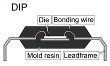 Commercial circuit packaging quickly moved to the dual in-line package (DIP), first in ceramic and later in plastic.[4] In the 1980s VLSI pin counts exceeded the practical limit for DIP packaging, leading to pin grid array (PGA) and leadless chip carrier (LCC) packages.[5] Surface mount packaging appeared in the early 1980s and became popular in the late 1980s, using finer lead pitch with leads formed as either gull-wing or J-lead, as exemplified by small-outline integrated circuit—a carrier which occupies an area about 30–50% less than an equivalent DIP, with a typical thickness that is 70% less.[5]