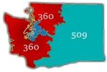 The 360 numbering plan area consists of two sections that are the result of numbering disputes in the community. The configuration arose when residents of several Seattle exurbs protested the loss of area code 206, and changing to 360.[1] In response, US West reassigned some central offices back to 206. However, 206 was under numbering pool pressure even after the creation of 360 and the restoration of these exurbs forced the Washington Public Utilities Commission to switch most of Seattle's suburban ring into areas 253 and 425 in 1998, sooner than originally planned.