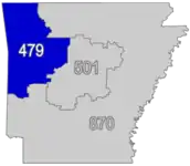 Area code 479 is a telephone area code in the North American Numbering Plan (NANP) for thirteen counties in the northwestern part of the U.S. state of Arkansas. The numbering plan area (NPA) includes the cities of Bentonville, Fort Smith, Fayetteville, Rogers, Siloam Springs and Springdale. It was created on January 19, 2002 in a split from area code 501.