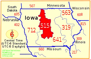 Area code 515 originally served the central part of the state, stretching border to border from Minnesota to Missouri. In 2000, the eastern and southern portions of the area were split off with area code 641, leaving 515 with only about one-fourth of its original area, including Des Moines and the area northwest of the city. Only one small portion in the north of the numbering plan area borders another state, Minnesota.