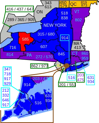 Area code 585 is the area code for Rochester and eight surrounding counties in Western New York. It was created on November 15, 2001, in a split from area code 716. Previously, Rochester had shared 716 with Buffalo.[1] Aside from new area codes created in the New York City metropolitan area and Long Island, 585 was the second new area code in New York since 1954, having been preceded by 845 in 2000.