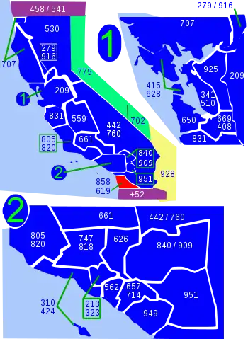Area codes 619 and 858 are telephone area codes in the North American Numbering Plan (NANP) for most of San Diego County in the U.S. state of California.