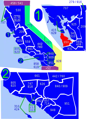 | West: Pacific Ocean, 808 | area code 650 | East: 510/341, 925 |