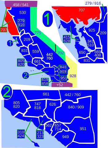 Area codes 707 and 369 are telephone area codes in the North American Numbering Plan (NANP) for the northwestern part of the U.S. state of California. The area codes serve part of the northern San Francisco Bay Area, as well as the North Coast. Major cities in the area codes include Napa, Sebastopol, Vallejo, Benicia, Fairfield, Santa Rosa, Windsor, Healdsburg, Rohnert Park, Petaluma, Fort Bragg, Rio Vista, Crescent City, Eureka, Clearlake, Vacaville, Dixon, and Ukiah. 707 was created by a split of area code 415 on March 1, 1959. Area code 369 was added to the numbering plan area (NPA) on February 1, 2023, to form an overlay numbering plan in the service area.