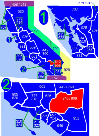 Area codes 909 and 840 are telephone area codes in the North American Numbering Plan (NANP) for the far-eastern part of Los Angeles County and southwestern San Bernardino County in the U.S. state of California.