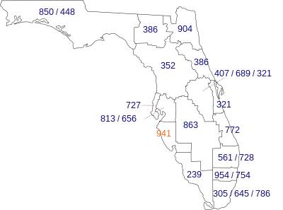 Area code 941 is an area code in Florida. Introduced on March 3, 1996,[1] it includes the counties of Manatee, Sarasota, and Charlotte, areas along the Sun Coast of southwestern Florida, USA. It is the area code for North Port-Bradenton-Sarasota, Florida Metropolitan Statistical Area. DeSoto County, Charlotte County, Hardee County, Polk County, Okeechobee County, Glades County, and Hendry County were part of this area code until 1999, when area code 863 was created,[1] and Lee County and Collier County were part of 941 until March 2003 when area code 239 was created. Before the 941 area code, the region was originally 305, then area code 813.