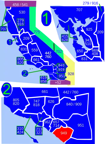 California area codes: 209, 213/323, 279/916, 310/424, 341/510, 408/669, 415/628, 442/760, 530, 559, 562, 619/858, 626, 650, 657/714, 661, 707, 747/818, 805/820, 831, 840/909, 925, 949, 951