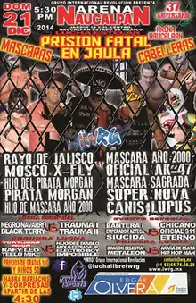All ten competitors in the main event steel cage match were supposed to fight for 10-minutes before they would be allowed to leave the ring, but Pirata Morgan and El Hijo de Pirata Morgan started the match off early by attacking Máscara Sagrada outside the ring as he was being introduced to the crowd.[1][14] Once the remaining competitors; Canis Lupus, El Hijo del Máscara Año 2000, Máscara Año 2000, Oficial AK-47, Rayo de Jalisco Jr., Súper Nova and X-Fly were inside the cage the match itself could start.[1][14] The match came down to Oficial AK-47 and X-Fly as the last two men in the cage. Moments later Oficial 911 came to ringside and helped his regular tag team partner defeat X-Fly.[1][14] As a result, X-Fly had all his hair shaved off.[1][14]