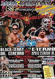 The Arena Naucalpan 38th Anniversary Show was a major annual professional wrestling event produced by Mexican professional wrestling promotion International Wrestling Revolution Group (IWRG), which took place on December 20, 2015 in Arena Naucalpan, Naucalpan, State of Mexico, Mexico. The show celebrated the 38th Anniversary of the construction of Arena Naucalpan, IWRG's main venue. In the main event the team known as Los Insoportables ("The Unbearables"; Eterno and Apolo Estrada Jr.) defeated Los Terribles Cerebros ("The Terrible Brains"; Black Terry and Dr. Cerebro), as a result of their loss Black Terry and Dr. Cerebro had all their hair shaved off under Luchas de Apuestas rules. The show also saw El Hijo de Dos Caras successfully defend the IWRG Intercontinental Heavyweight Championship and Imposible successfully defend the IWRG Intercontinental Lightweight Championship.