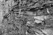 Arenite (Latin: arena, "sand")[1] is a sedimentary clastic rock with sand grain size between 0.0625 mm (0.00246 in) and 2 mm (0.08 in) and contain less than 15% matrix.[2] The related adjective is arenaceous. The equivalent Greek-derived term is psammite, though this is more commonly used for metamorphosed sediments.