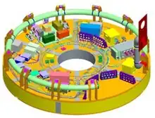 The upper-stage simulator (USS) was manufactured by NASA personnel at Glenn Research Center in Cleveland.[8] Because of transportation limitations (bridge heights on highways and rivers), the simulator was built out of eleven steel segments 9.5 feet (2.9 m) tall by 18 feet (5.5 m) wide. The USS simulated the shape, mass, and center of gravity characteristics of Ares I from the interstage to the top of the service module of the Orion Crew exploration vehicle. The centers of mass for the liquid hydrogen and liquid oxygen tanks were simulated through the use of steel ballast plates.[6]:7