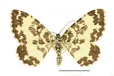 The argent and sable moth (Rheumaptera hastata) is a day-flying moth of the family Geometridae, with distinctive black and white colors. They tend to live on wetlands and hillsides. The larvae spin together the leaves of their food plants (such as birch and bog myrtle) to form their cocoons. It was named argent and sable in 1778. Argent and sable refer to the heraldic color names for white and black. Their distribution is Holarctic. The species was first described by Carl Linnaeus in his 1758 10th edition of Systema Naturae.[1]