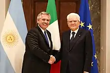 In 2017, trade between Argentina and Italy totaled US$2.7 billion.[26] In the same year, Italian president Sergio Mattarella made a state visit to Argentina, which allowed to realize a business mission organized by the General Confederation of Italian Industry, MISE and MAECI.[27] In 2019, Italian exports to Argentina amounted to €881,99 million (€1.153,65 million in 2018), and imports reached €988,89 million (€1.019,3 million in 2018) (source: ISTAT).[28]