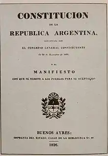 The Argentine Constitution of 1826 was a short-lived Constitution of Argentina drafted during the Argentine Civil Wars. Bernardino Rivadavia was appointed President of Argentina under this constitution. It was rejected by most Argentine provinces, and then abolished.