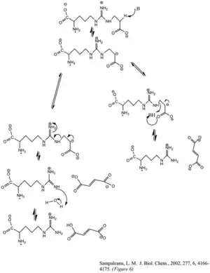The enzyme's cleavage of the argininosuccinate, to form fumarate and arginine, occurs through an E1cb elimination reaction. The base initiates the reaction by deprotonating the carbon adjacent to the arginine, or leaving group. Recent mutagenic studies of ASL homologues have shown that Histidine 162 or Threonine 161 of ASL is responsible for the proton abstraction of the Cβ, either directly or indirectly through a water molecule.[6] Lysine 289 is thought to stabilize the negatively charged carbanion intermediate. Although there is no consensus of the catalytic acid that donates the proton to the imine functional group of the arginine product, some mutagenesis studies show serine 283 may be involved.[6]