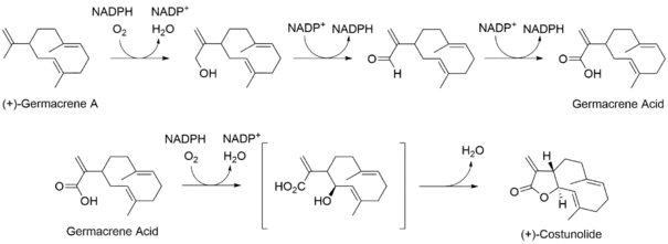 Fig. 2. Subsequent oxidation followed by lactonization to form (+)-costunolide, a precursor for the guaianolide skeleton.