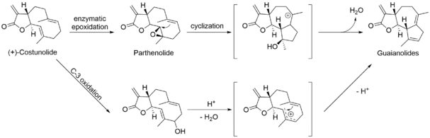 Following the formation of the 10-member ring system of (+)-germacrene A, two subsequent oxidation steps formed germacrene acid. Germacrene acid could then be hydroxylated and undergo lactonization to form (+)-costunolide, a branching point for the biosynthesis of sesquiterpene lactones. (Fig. 2) From here, the biosynthesis of guaianolides can follow two proposed pathways. In the first pathway, (+)-costunolide undergoes enzymatic epoxidation forming parthenolide. Parthenolide undergoes trans-annular cyclization and elimination to form the guaianolide skeleton. The second pathway includes the enzymatic hydroxylation of (+)-costunolide followed by dehydration and cyclization to give the guaianolide skeleton. (Fig. 3) Further epoxiation of the guaianolide skeleton would yield the desired sesquiterpene lactone, arglabin.[5]
