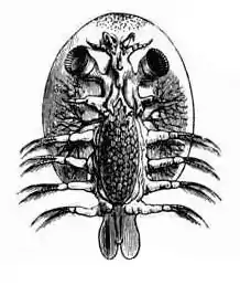 A typical fish louse of the genus Argulus is very flat with an oval or rounded carapace, two compound eyes, sucking mouthparts with a piercing stylet, and two suction cups it uses to attach to its host.[4] These "suctorial organs" are the first of its two pairs of maxillae, modified in shape.[5] Its paired appendages have hooks and spines,[4] and are used for swimming.[5] A. foliaceus in particular is up to 7 millimeters long by 5 millimeters wide.[5] The female is larger than the male and has a visible pair of spermathecae on its posterior end, in which the male deposits sperm.[4]