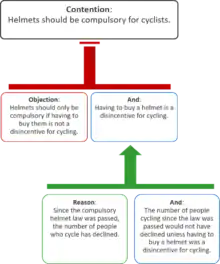 An argument map or argument diagram is a visual representation of the structure of an argument. An argument map typically includes the key components of the argument, traditionally called the conclusion and the premises, also called contention and reasons.[1] Argument maps can also show co-premises, objections, counterarguments, rebuttals, and lemmas. There are different styles of argument map but they are often functionally equivalent and represent an argument's individual claims and the relationships between them.